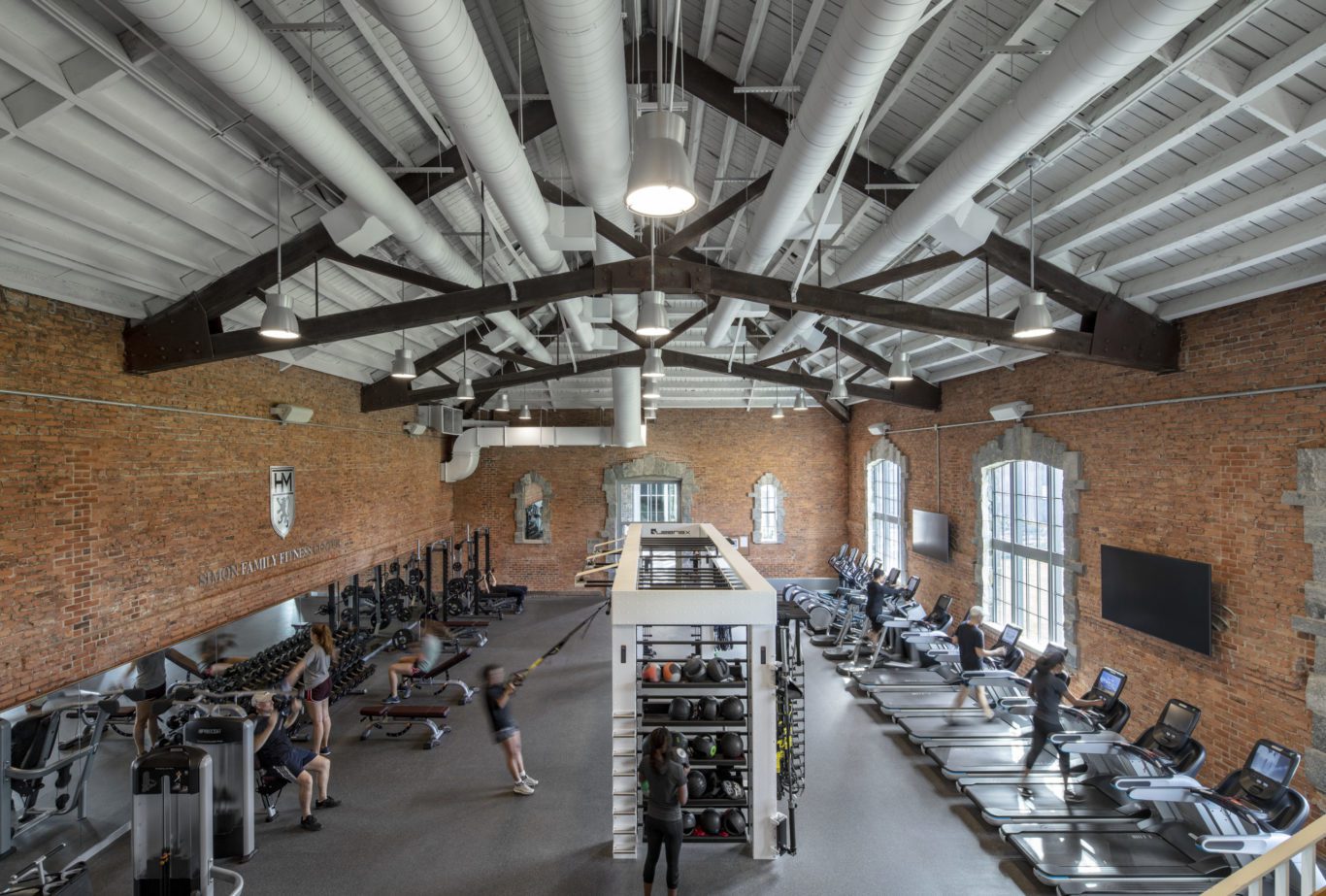 The stone and brick facades of the new structures harmoniously blend with the historic Prettyman Gymnasium building, built in 1924. This gym was also modernized: the lower level was restored, and the pool was converted into a state-of-the-art fitness center. Architects preserved the authentic elements—wooden beams and red brick—while integrating a new lobby that provides access to all four levels of the building, adding convenience and creating a more open space.