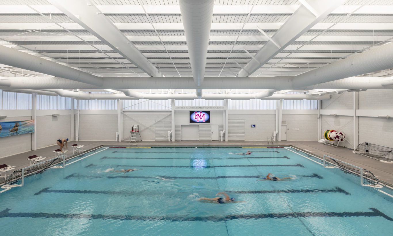 - An aquatic center with an eight-lane pool, a movable floor, seating for 150, and versatile locker rooms—an ideal space for water polo and sports.