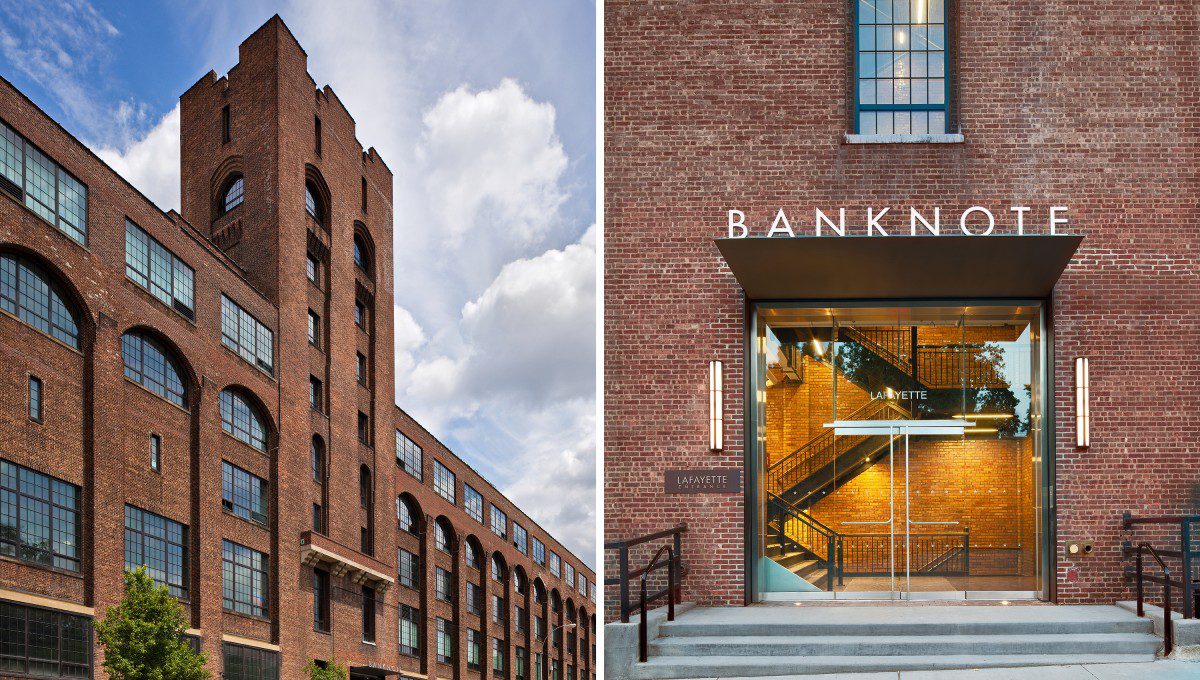 - The Lafayette Wing was an elongated, narrow structure with a facade almost 142 meters long that served as the administrative center and housed the engraving rooms. A nine-story tower stood in the center of the complex. The structure had a steel frame faced with brick, with large arched windows that let in maximum daylight, which was important for controlling print quality. Stylistically, the building references the German architectural style of Rundbogenstil, popular in the 1830s-1840s.